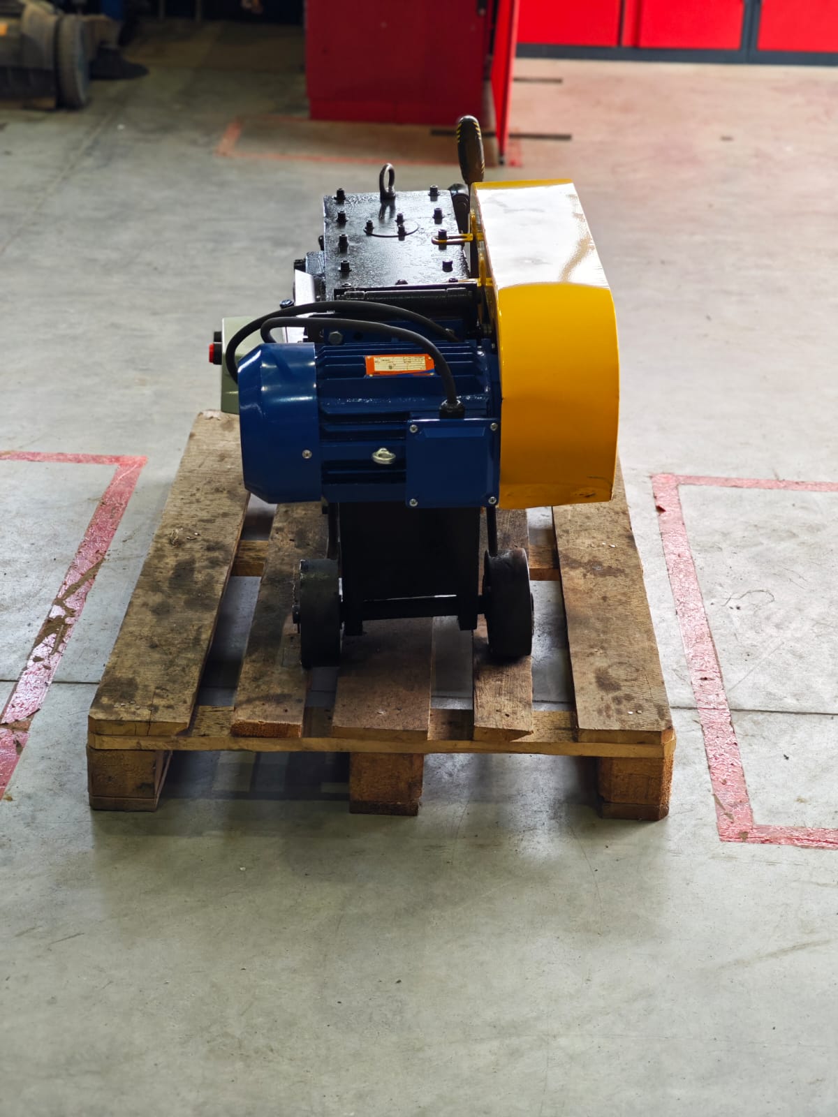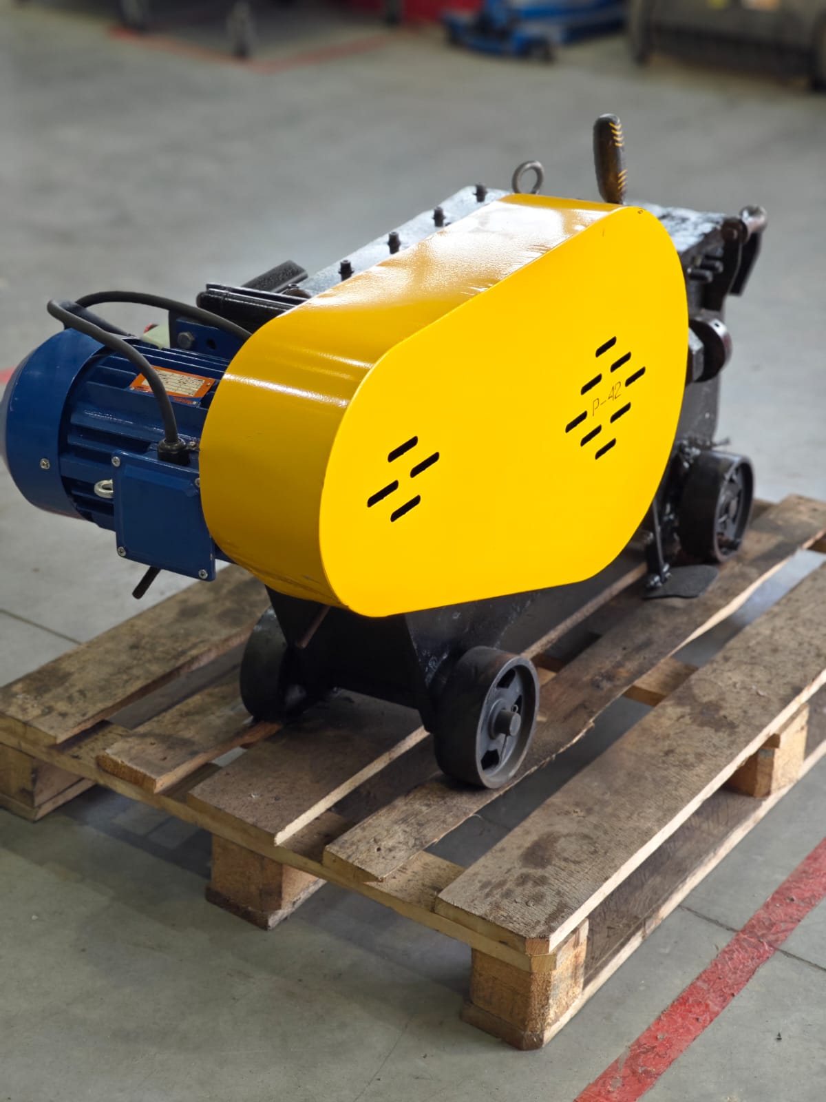 - удобство переноса обеспечивается колесами, на которые опирается станок (можно снять при стационарном использовании), а также специальными рым-болтами для зацепа крюком подъёмного крана (удобно при перемещении с этажа на этаж),