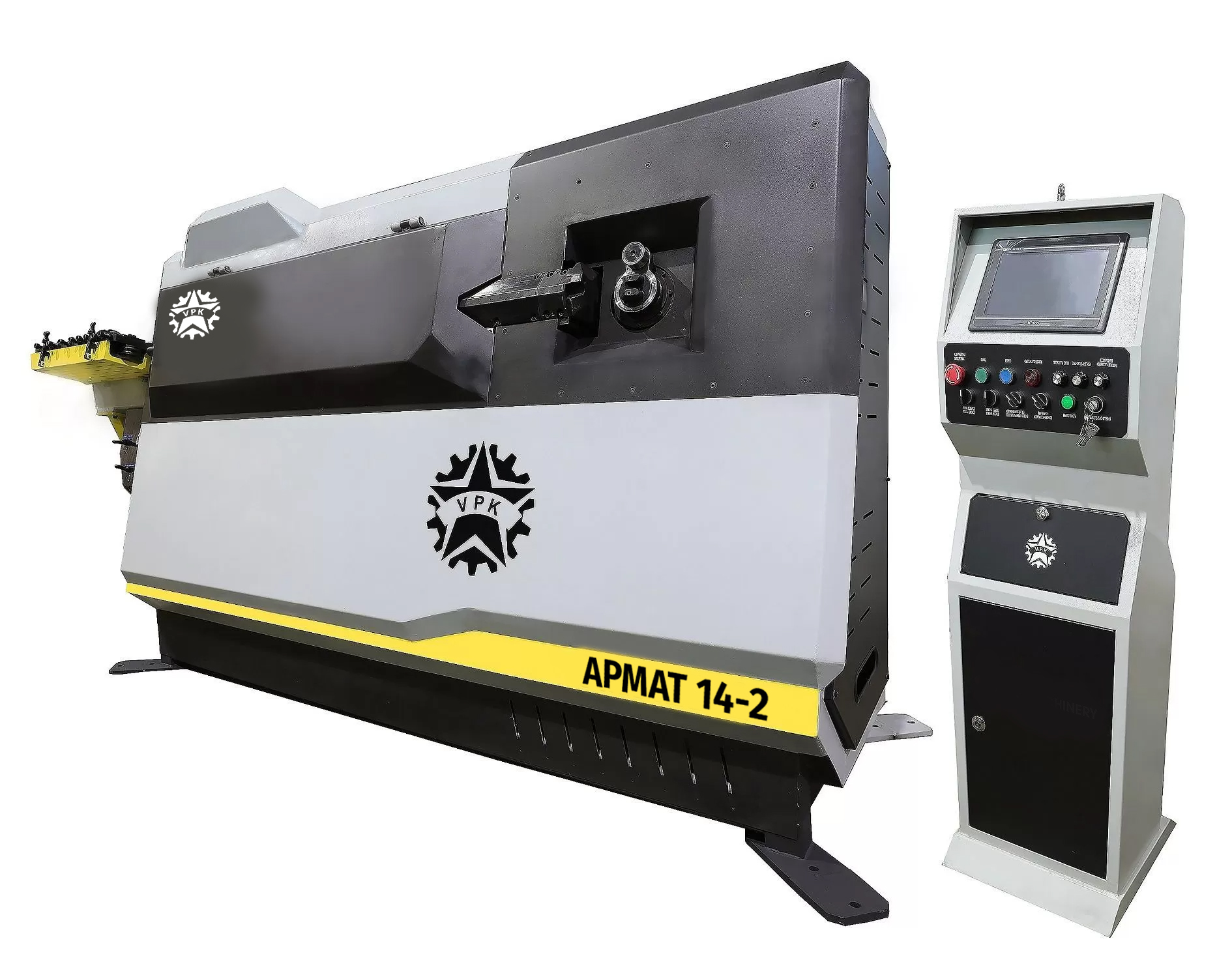 АРМАТ 14-2 представляет собой автоматизированный правильно-гибочный станок с ЧПУ, который используется для изготовления хомутов, углов, деталей специальной формы и т.д. Он может выполнять функции правки, гибки, резки и подсчета готовых изделий из арматурной стали в бухтах А-I диаметром от 6 до 14 мм и А-III диаметром от 6 до 12 мм.