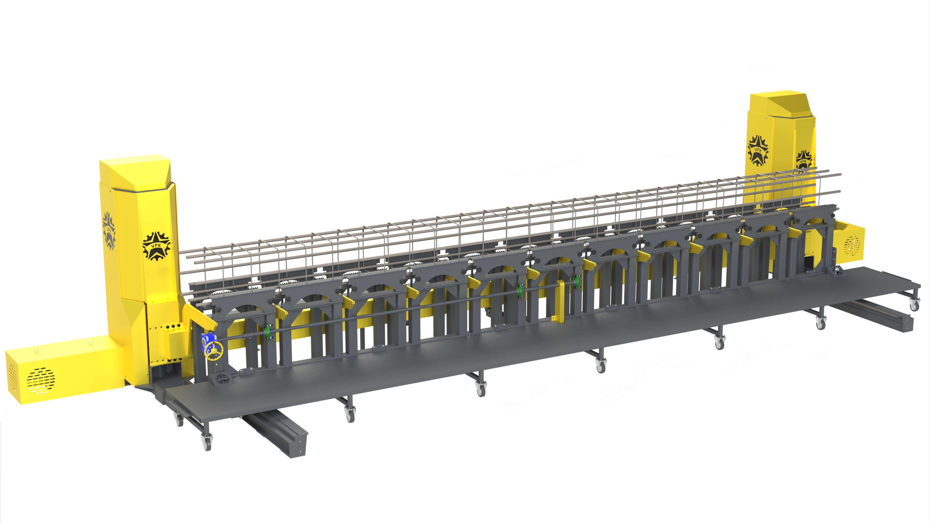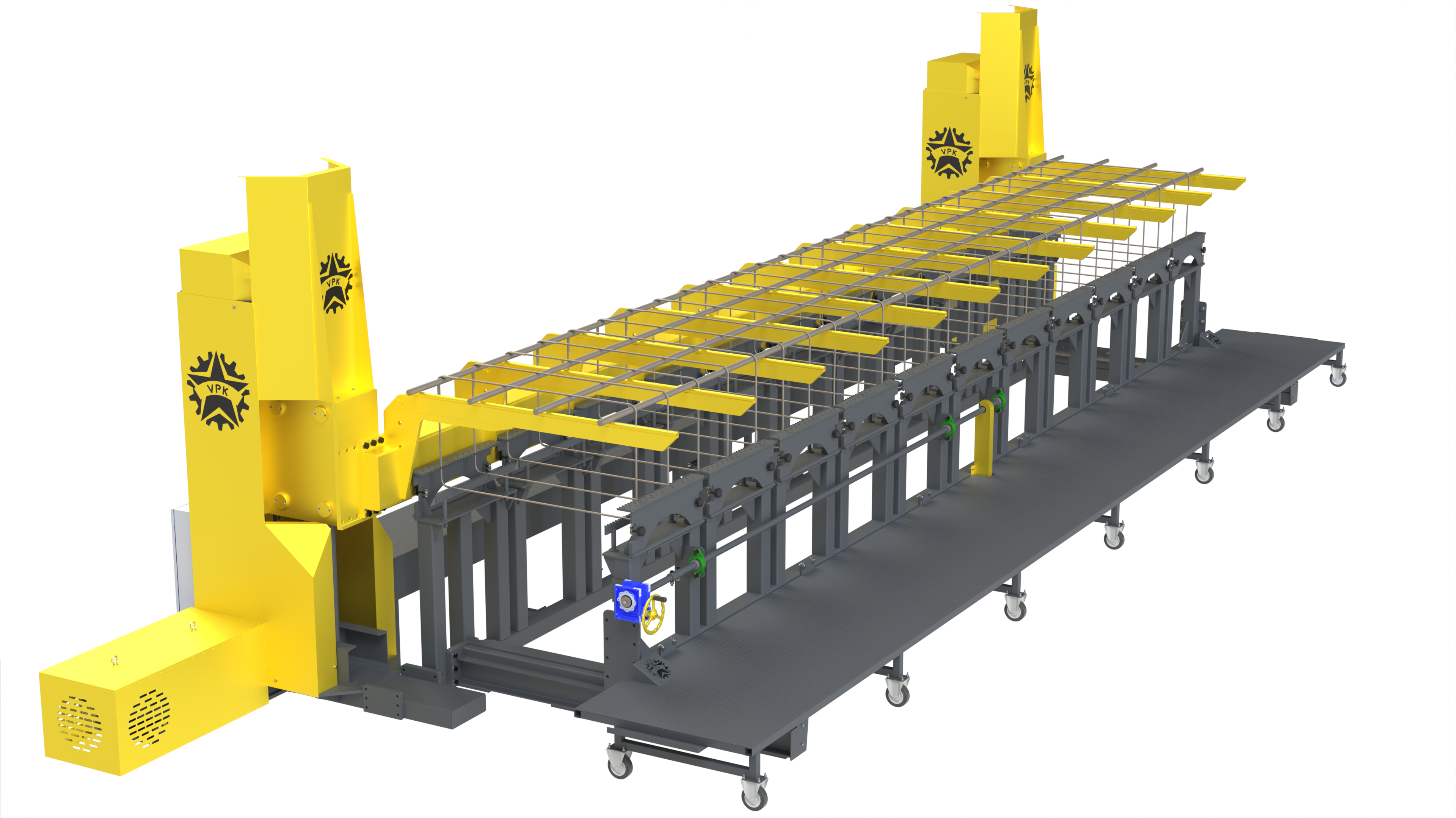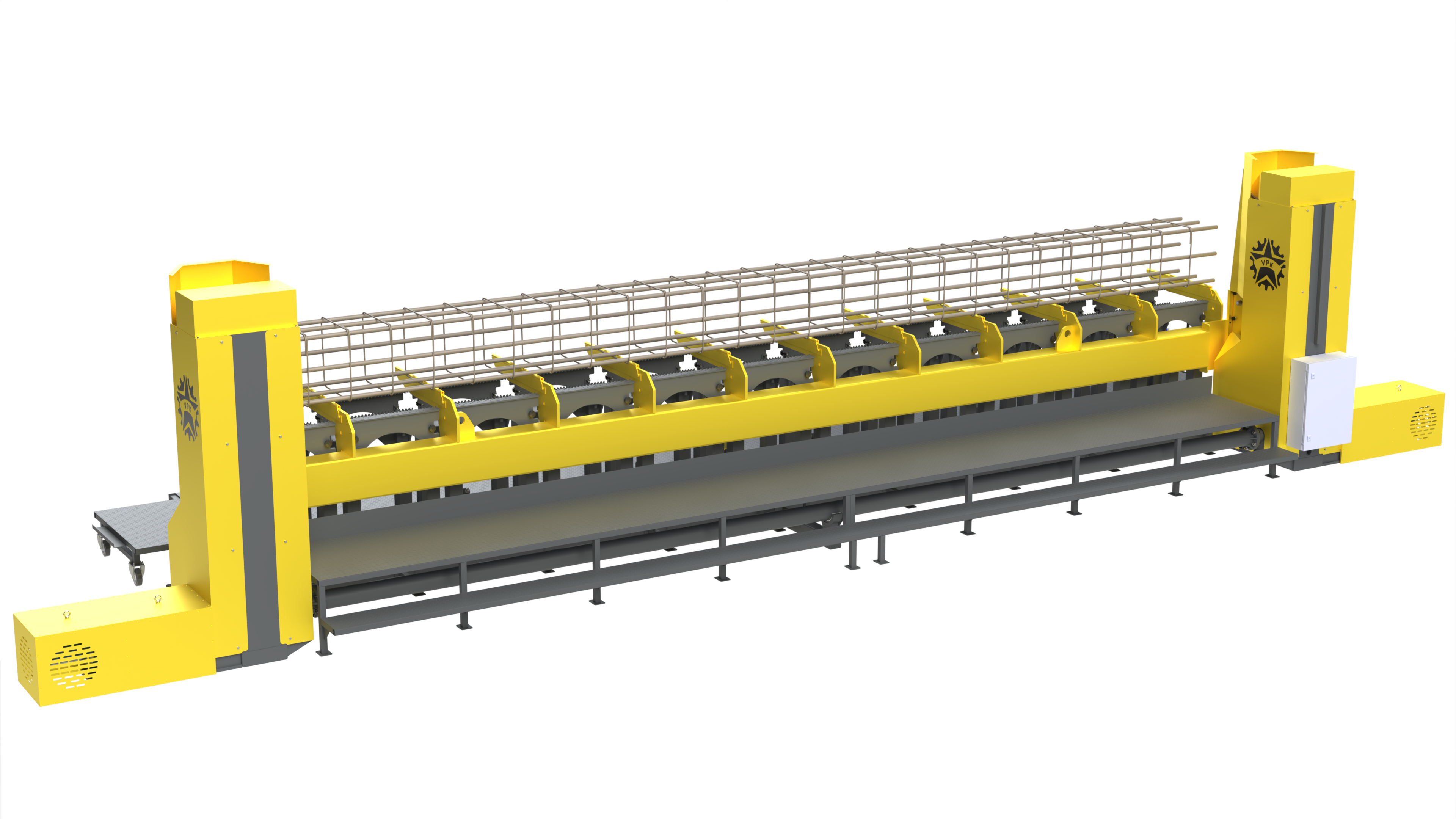 Для укладки на требуемую высоту продольных прутков арматуры (внутри хомутов) балки с горизонтальными направляющими перемещаются двумя мотор-редукторами.