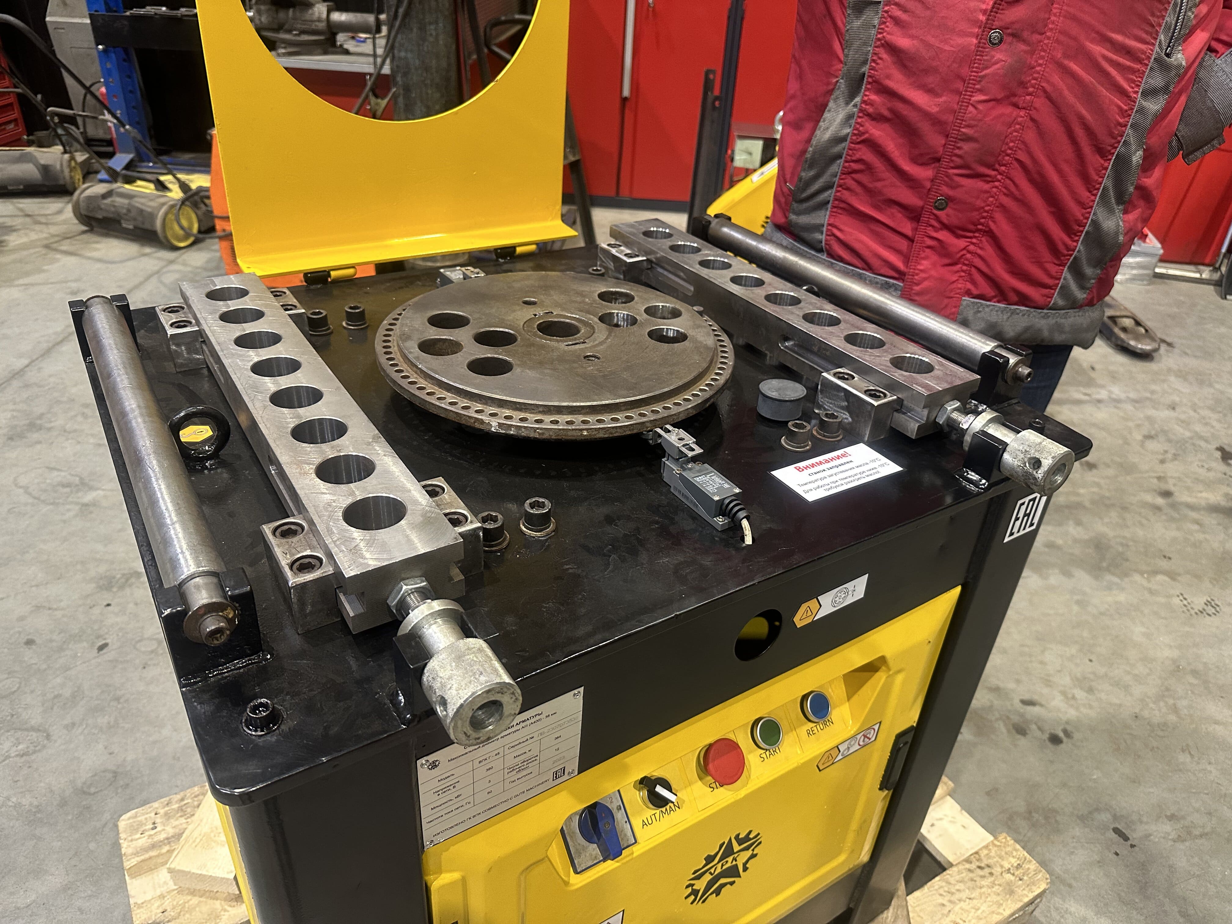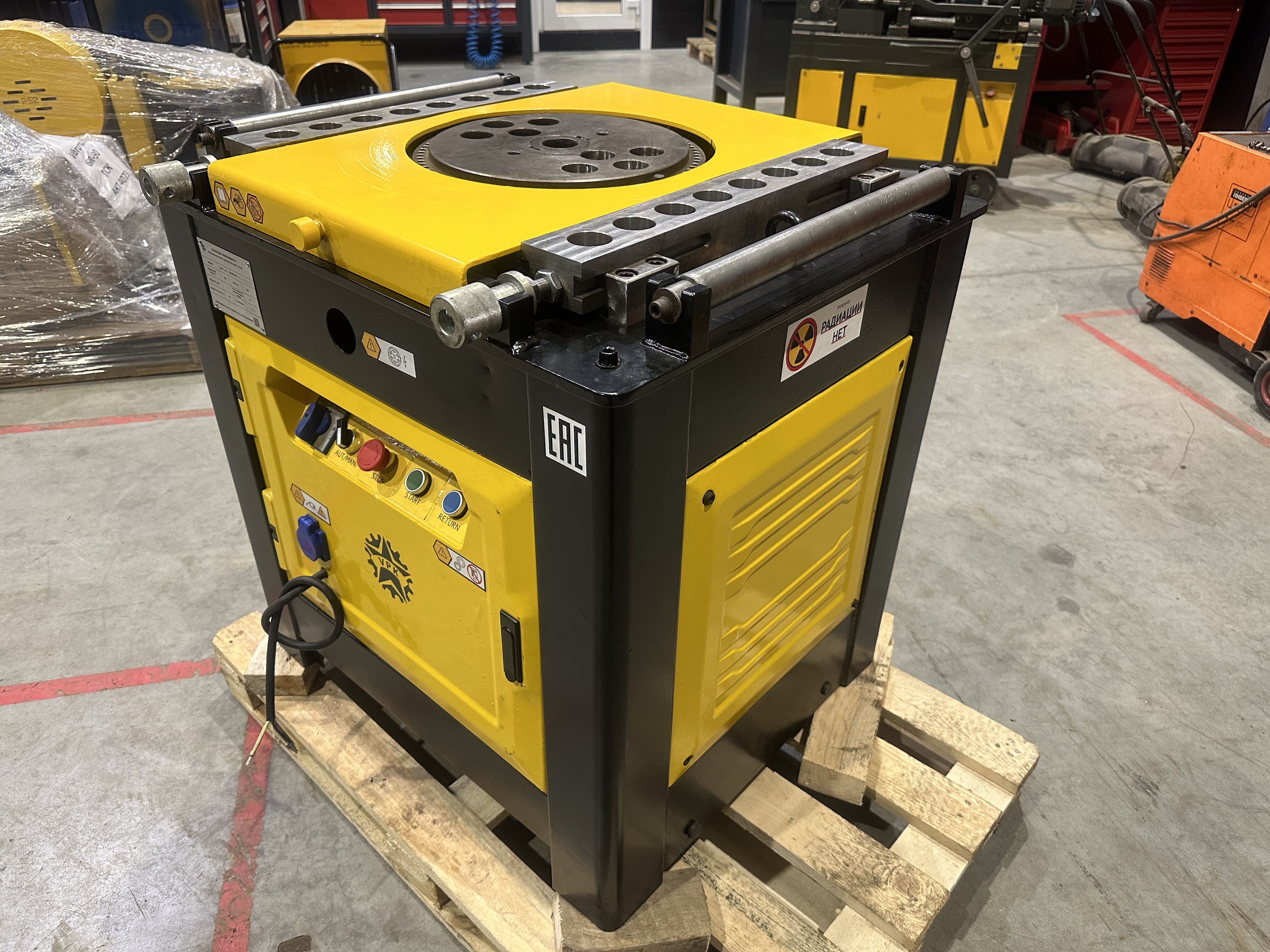 Гибка арматуры на станке ВПК Г-45 происходит вокруг оси вращения поворотного диска. Поворотный диск приводится во вращение при помощи электромотора и редуктора. Гибка производится как в ручном, так и автоматическом режиме. Требуемый радиус, форма и углы изгиба арматуры достигаются путем выбора определенных втулок и углов поворота диска.Состояние — Хорошее