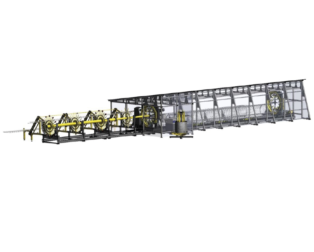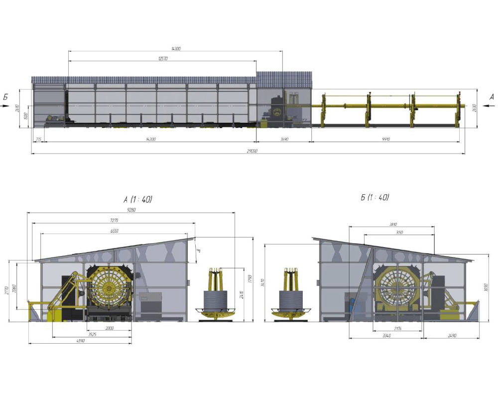 Выгрузка каркасов предусматривается ТОЛЬКО в горизонтальном направлении (методом «скатывания») в зону приёмщика готовых изделий. Обшивка конструкции выполнена аналогично базовой версии. Проём для выгрузки каркасов защищён тентом, открывающимся при помощи электромотора в обе стороны.