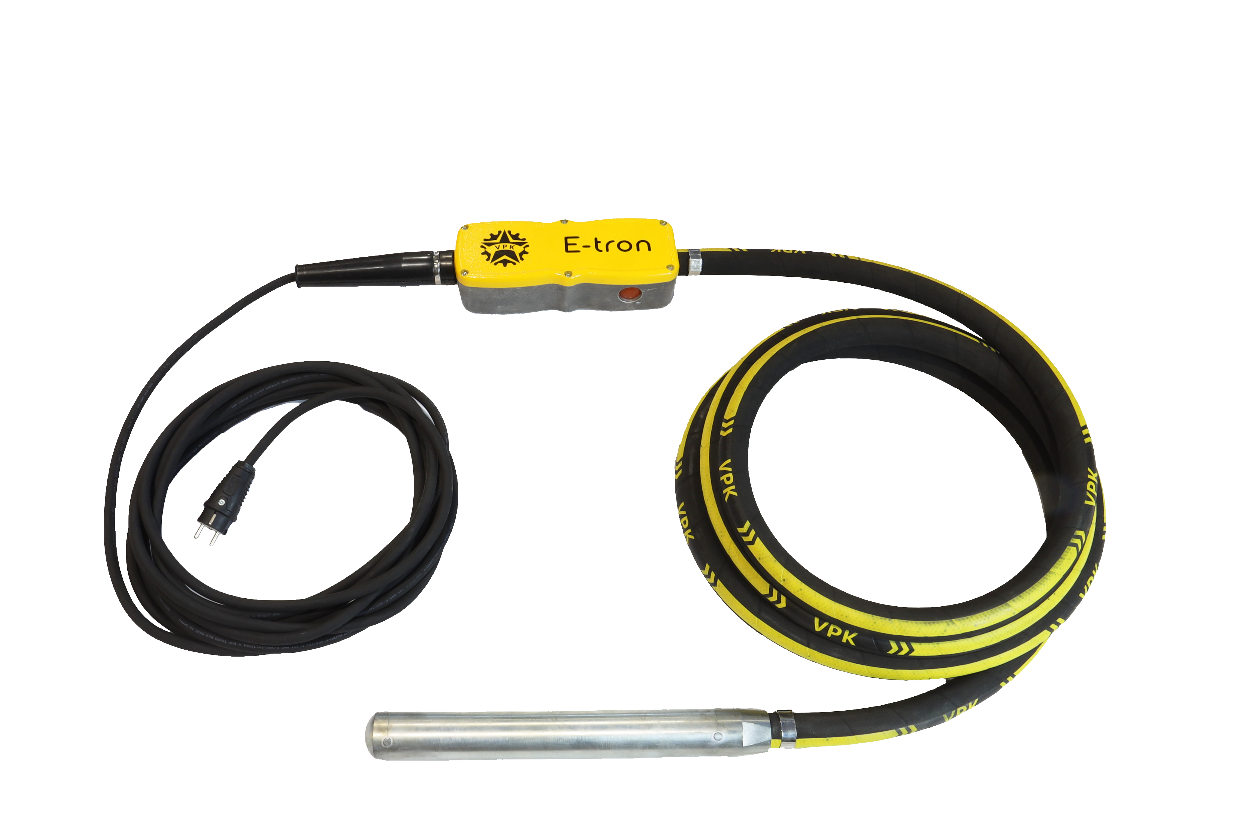 Глубинный вибратор серии VPK E-tron состоит из: вибробулавы, где находится электрический мотор,резинового кабеля, в которой находятся провода, питающие двигатель,герметичной кнопочной панели с выключателем,кабеля питания с вилкой, подсоединяемого к сети напряжением 230 В и частотой 50/60 Гц.